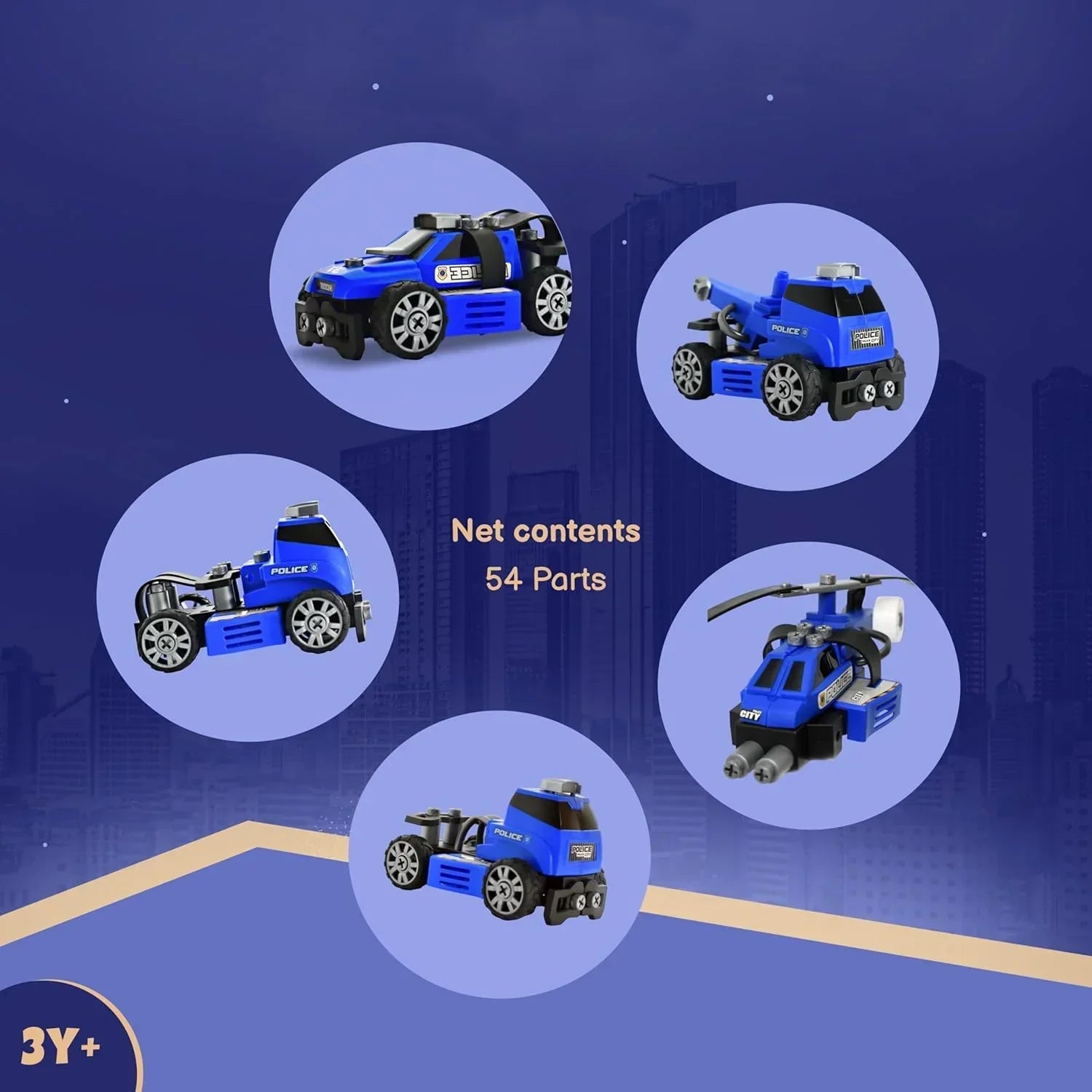 54-Piece DIY Construction Set: All components needed to build five unique police-themed vehicles or setups.