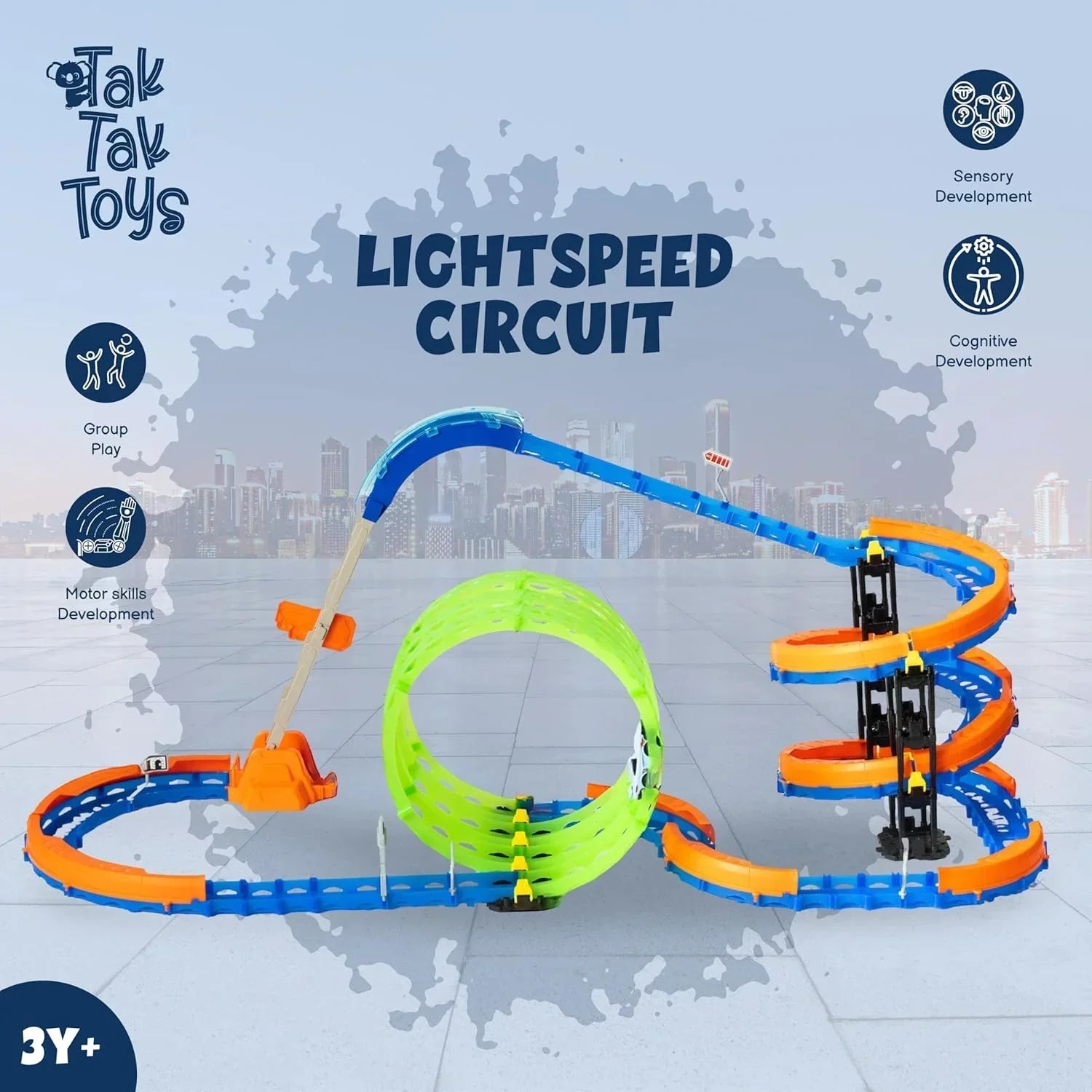 Gear up for thrilling adventures with the Tak Tak Toys Race Into The Future with Lightspeed Circuit – The Glow Track Set, a glow-in-the-dark racing toy designed to bring high-speed excitement to kids of all ages. Whether it's daytime fun or nighttime action, this unique track system lights up every race with glowing pathways and imaginative challenges. Ideal for children aged 4 and above, this playset promotes creativity, coordination, and hands-on engagement through an easy-to-assemble modular track design.