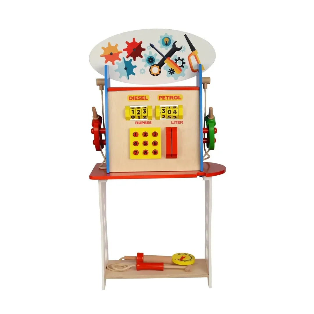 HILIFE Wooden Gas Station Pretend Play Set – Educational Toy for Kids with Number Keypad, Tools, and Gears