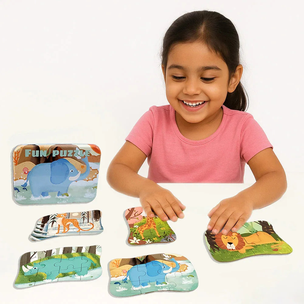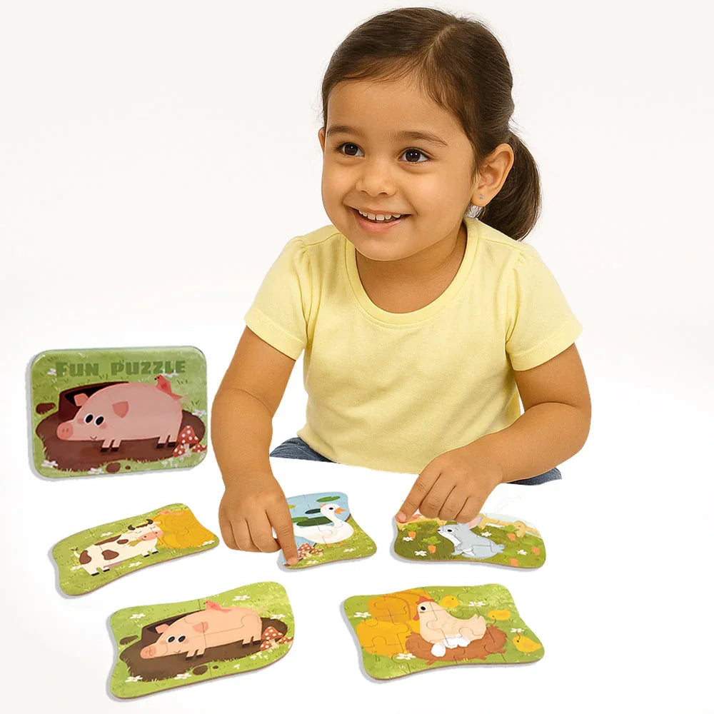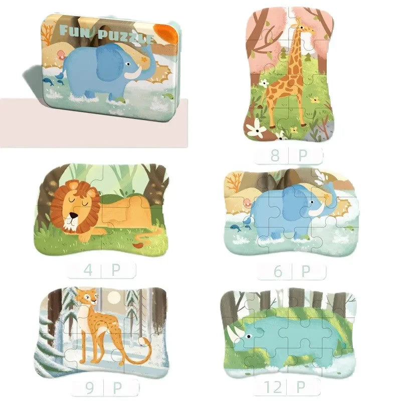 Progressive Puzzle Metal Box toddlers to learn colors, shapes, numbers, and different object recognition. 5 different puzzles in every box.  Builds tactile, motor, thinking, and learning skills, help to develop children's cognitive abilities, hand-eye coordination, fine-motor skills. They are fun, brain-boosting, stimulating, and provide a learning experience while playing.