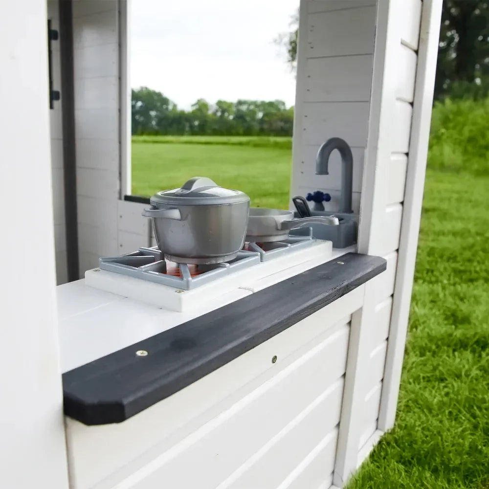 This playhouse features wide windows that flood the interior with natural light, enhancing the bright and airy feel inside. A cleverly designed snack window allows children to engage in imaginative serving and social play, while the half-door encourages interactive role-playing and easy access. Inside, kids will discover a play sink, stove, cordless phone, and a working doorbell—all carefully integrated to stimulate creativity and pretend play.