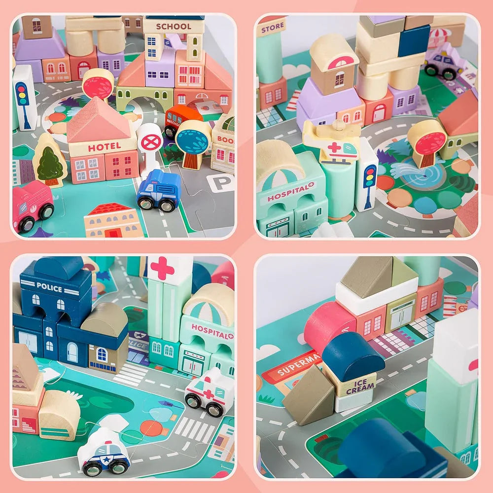 WUDLY 115 Pieces Wooden City Building Blocks