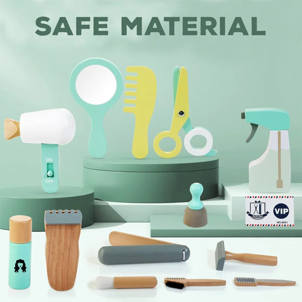 The set features a wooden comb, hairdryer, scissors, and other salon accessories, all beautifully crafted from natural wood and painted with child-safe, non-toxic finishes. Compact and easy to store, this wooden toy set is the perfect gift for young fashionistas!