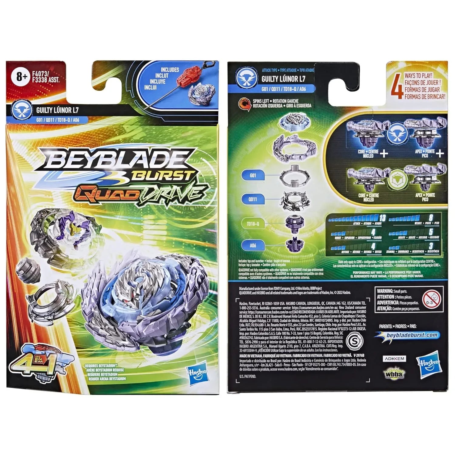 Beyblade Burst QuadDrive Guilty Lúinor L7 Starter Pack – 4-in-1 Customizable Left-Spin Beyblade Top