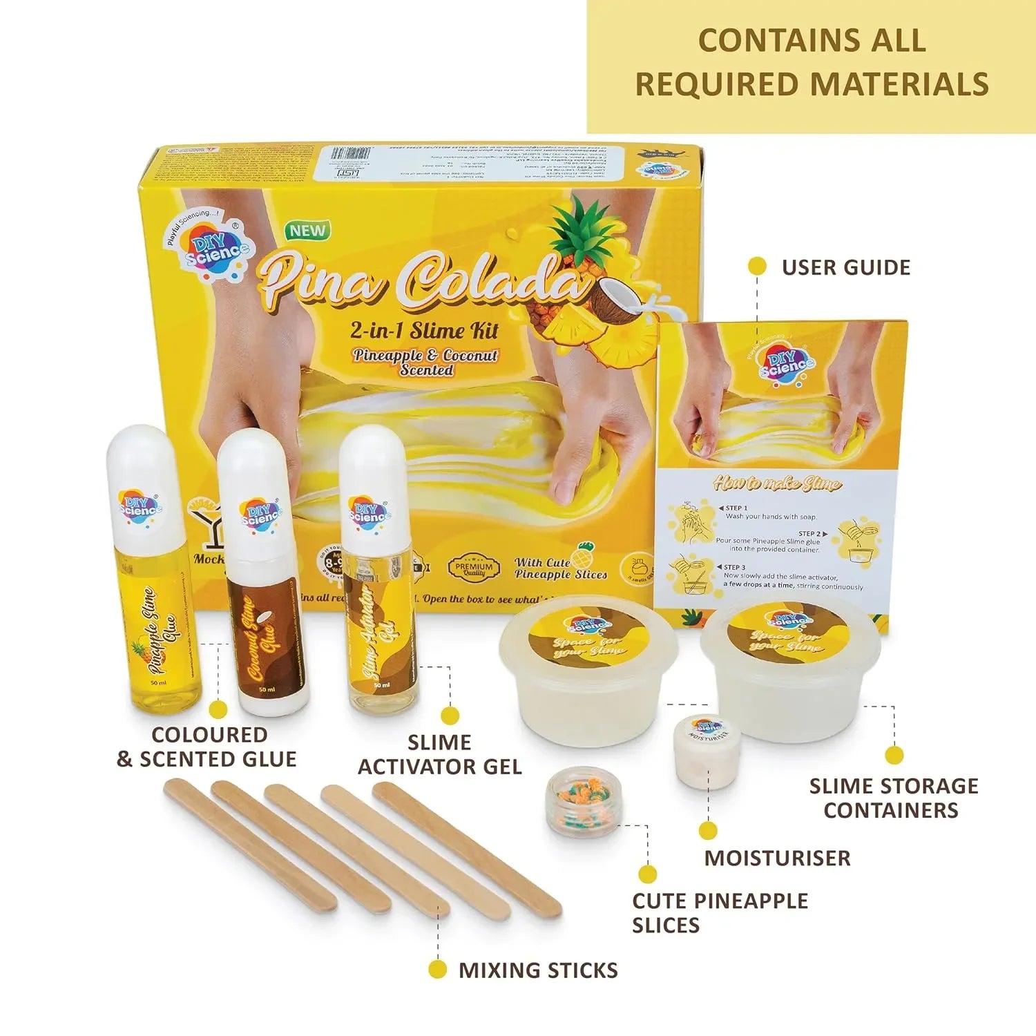 Dive into a tropical slime-making adventure with the Pina Colada 2-in-1 Slime Kit by DIYScience! Perfect for kids aged 8 and up, this unique kit lets young creators craft two irresistible slimes, each with its own delightful scent: pineapple and coconut. The textures are smooth and refreshing, just like the perfect mocktail! With colored and scented PVA glue, activator gel, and charming pineapple toppings, this DIY kit offers endless creative possibilities. Whether it’s for a birthday, a return gift, or just a fun activity to stimulate fine motor skills, scientific thinking, and creativity, the Pina Colada Slime Kit delivers hours of hands-on learning and sensory exploration. Plus, it’s made with non-toxic, eco-friendly ingredients, ensuring a safe and enjoyable experience for kids and adults alike. Get ready for some sensory play and start crafting your own tropical slime masterpiece!