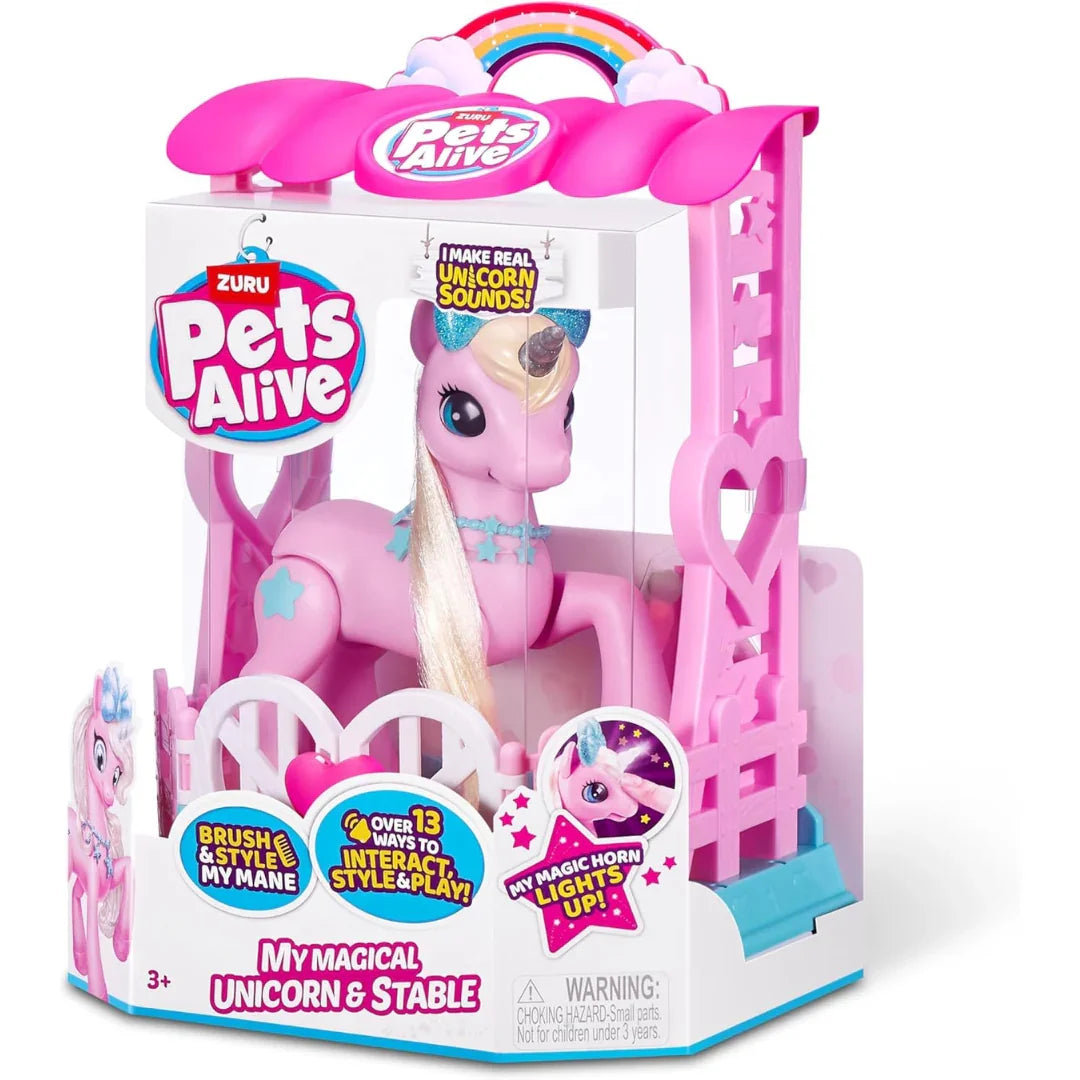 Bring a touch of enchantment to playtime with the ZURU Pets Alive Magical Unicorn Stable Playset, a beautifully designed interactive unicorn companion that inspires imagination, nurturing play, and joyful creativity. This lovable unicorn is more than just a toy—it's a friend that reacts, responds, and invites children into a magical world of pretend play. Designed for ages 3 and above, this playset blends interactive features with hands-on styling, making it a perfect choice for kids who love caring for animals, storytelling, and sparkly fantasy fun.