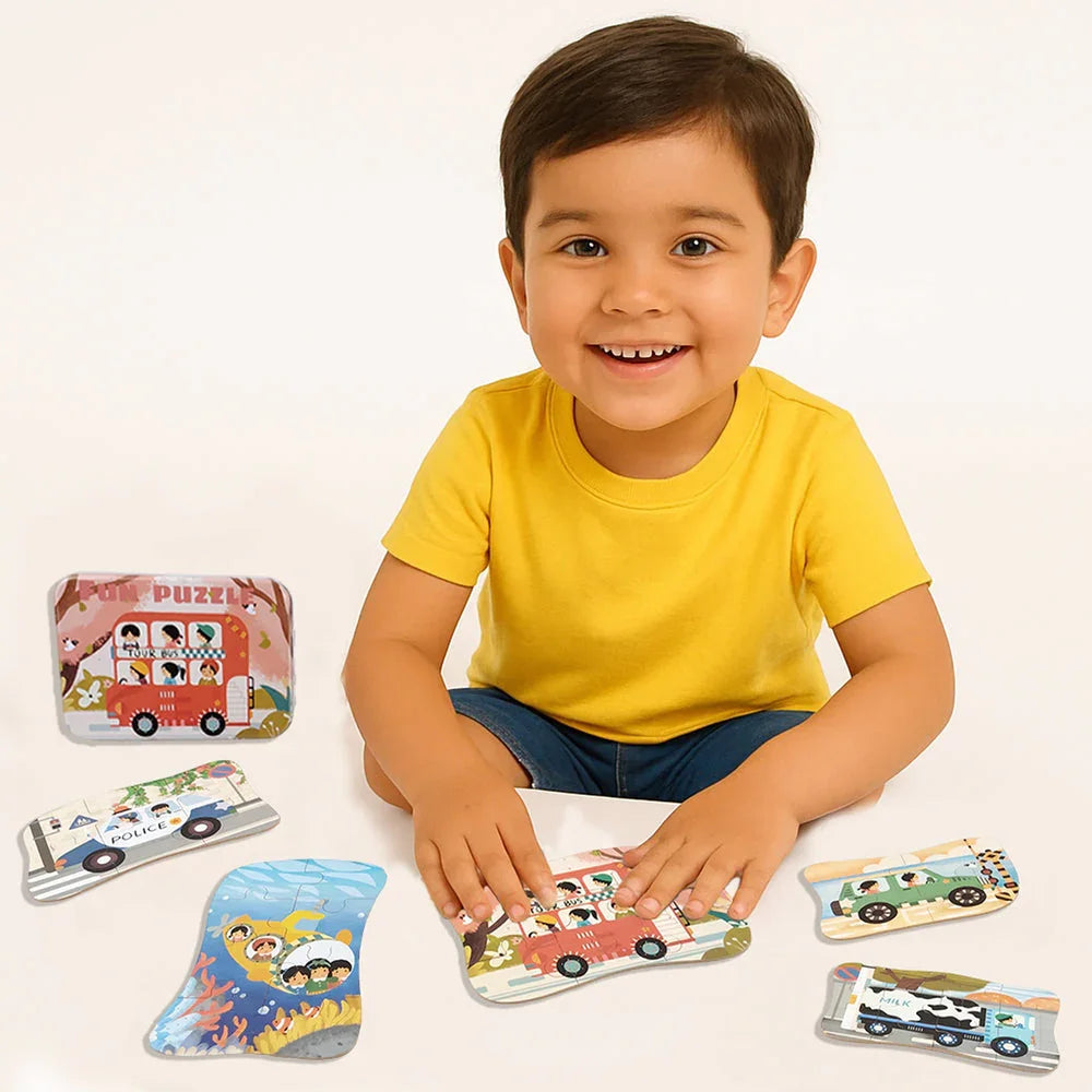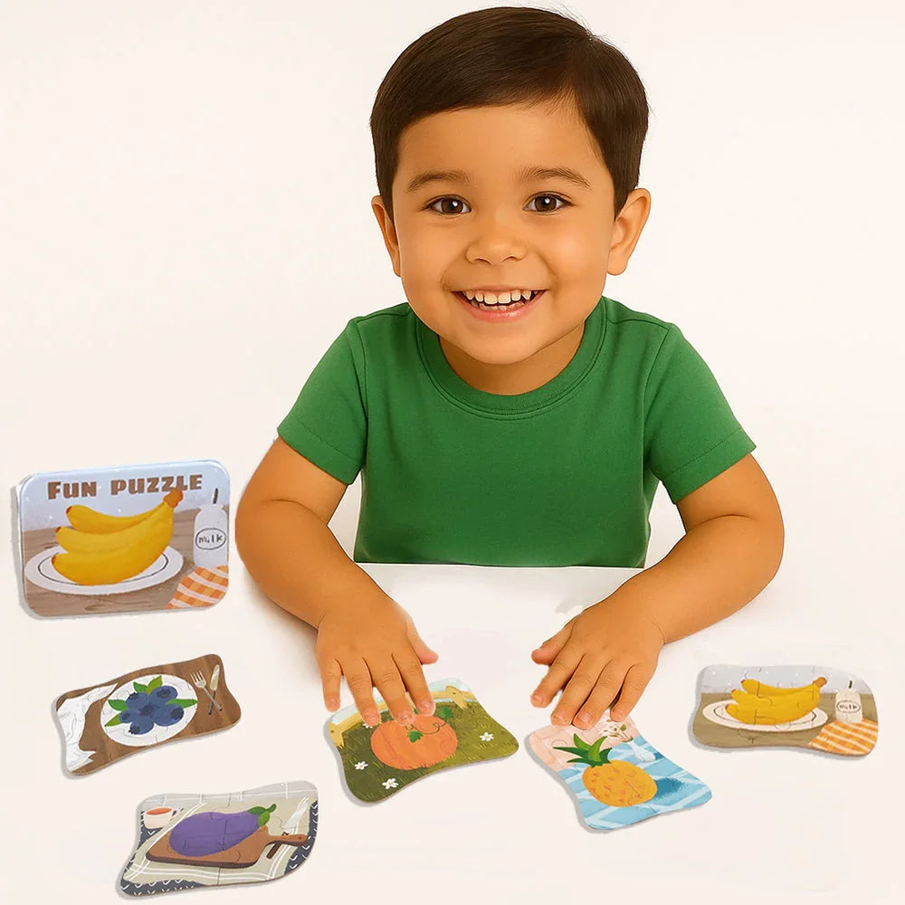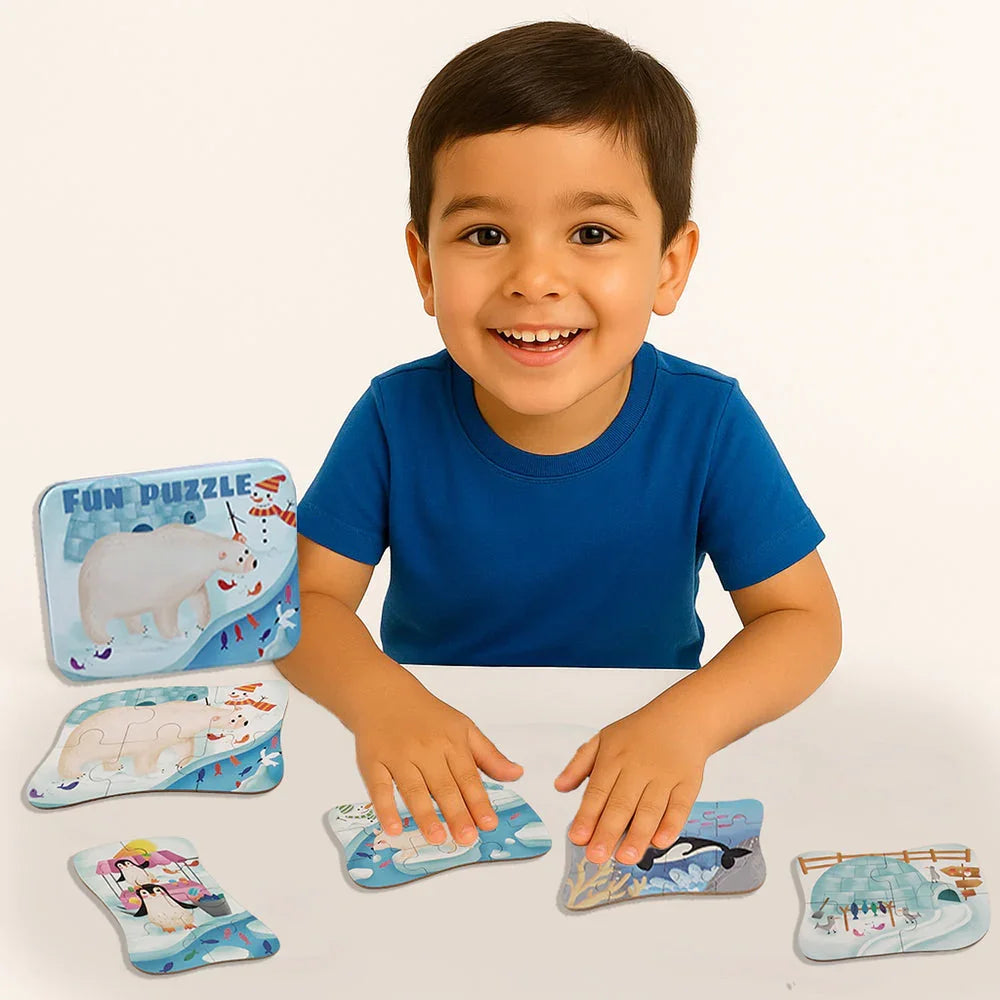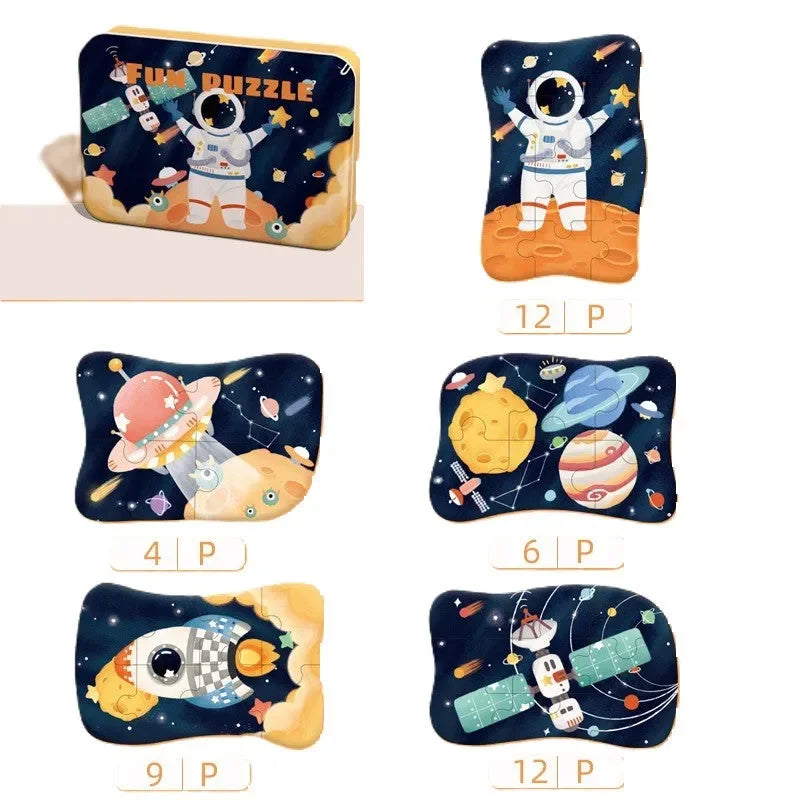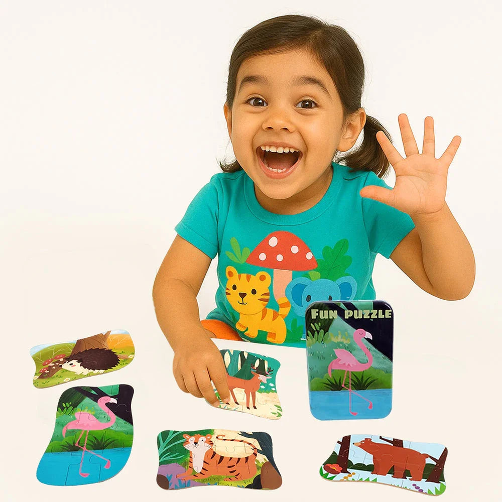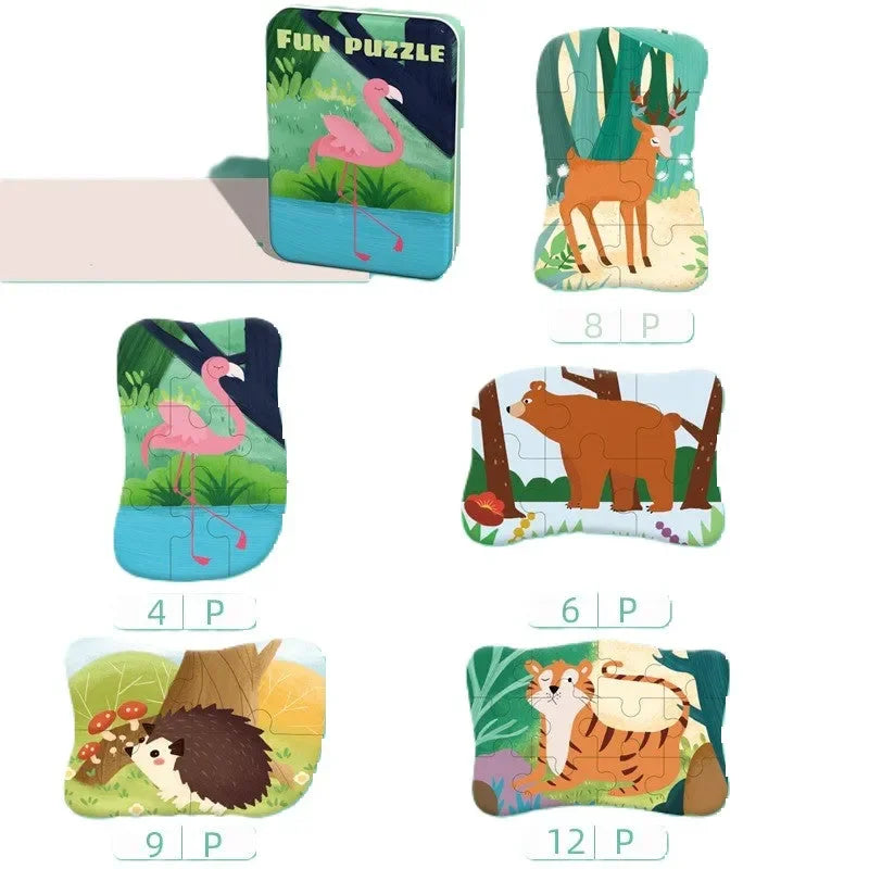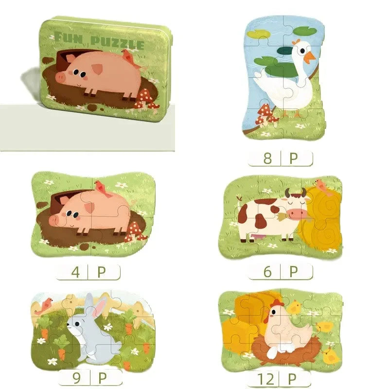 Progressive Puzzle Metal Box toddlers to learn colors, shapes, numbers, and different object recognition. 5 different puzzles in every box.  Builds tactile, motor, thinking, and learning skills, help to develop children's cognitive abilities, hand-eye coordination, fine-motor skills. They are fun, brain-boosting, stimulating, and provide a learning experience while playing.
