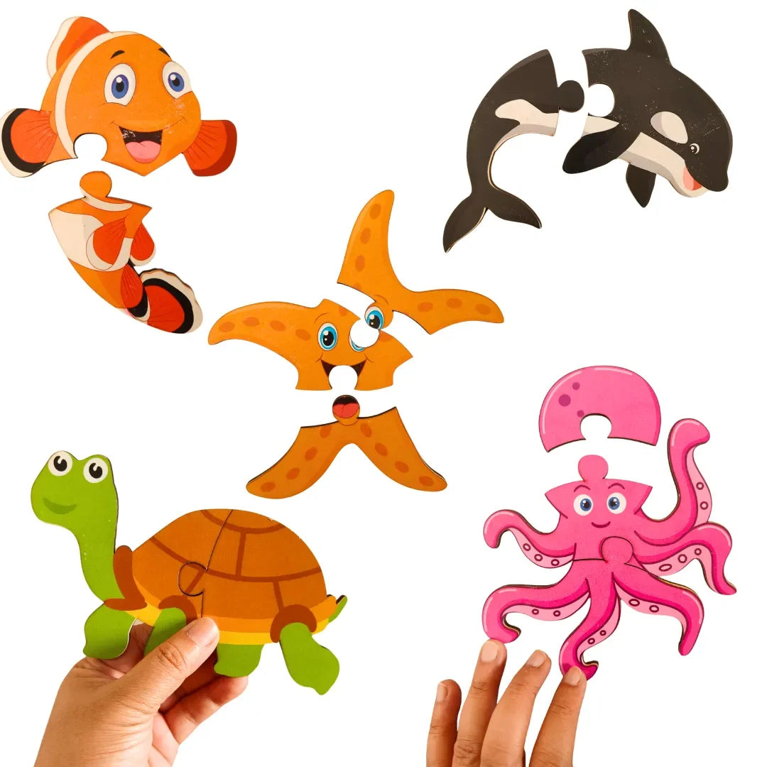 JoGenii First Puzzles Marine Animals Jumbo Wooden Puzzles - Set of 5 - 2 & 3 piece puzzles
