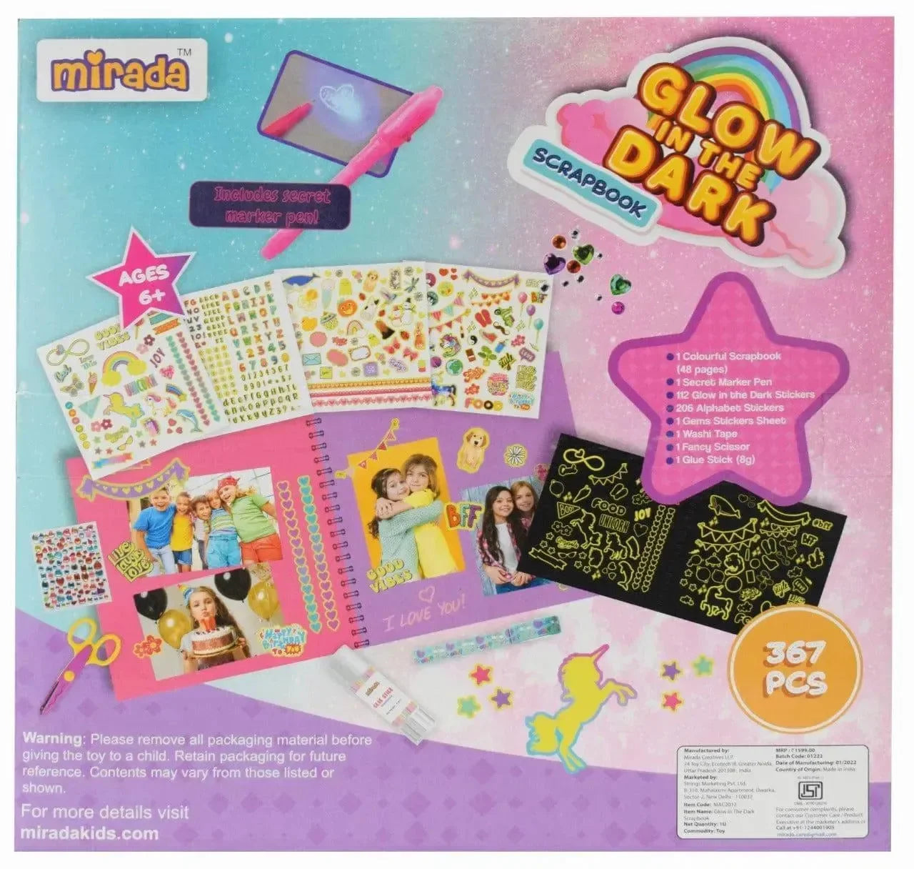 Mirada Glow in the Dark Scrapbook Kit – 367-Piece DIY Craft Set for Kids – Secret Message Pen with LED Light, Stickers, Gems, Washi Tape & More – Fun Keepsake Book