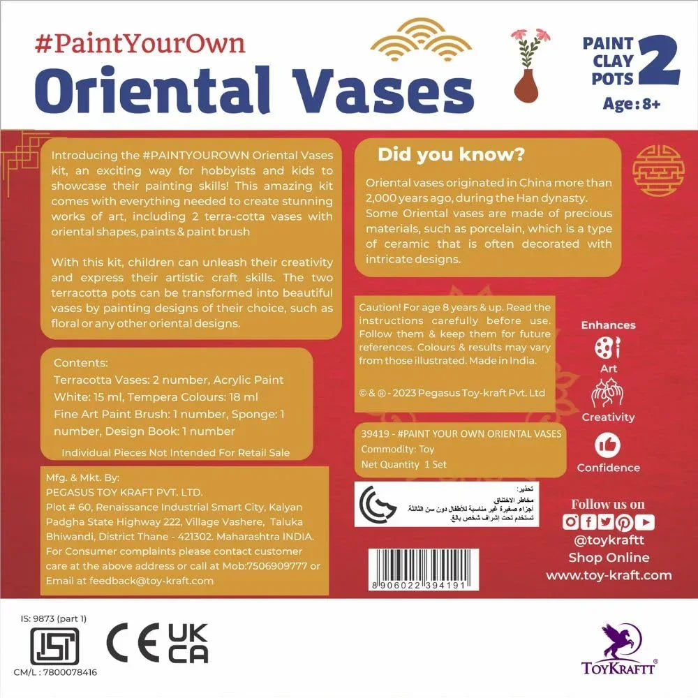 Unlock your child's creative potential with the Toykraftt Oriental Vases Pot Painting Kit, a thoughtfully designed art and craft kit perfect for kids aged 8 to 12. Part of Toykraftt’s innovative #PaintYourOwn series, this DIY set introduces children to the world of oriental design while offering a hands-on, screen-free artistic experience. Whether used as an engaging solo activity or as a bonding session with parents or siblings, this kit turns simple terracotta vases into personalized art pieces inspired by cultural motifs and traditions.