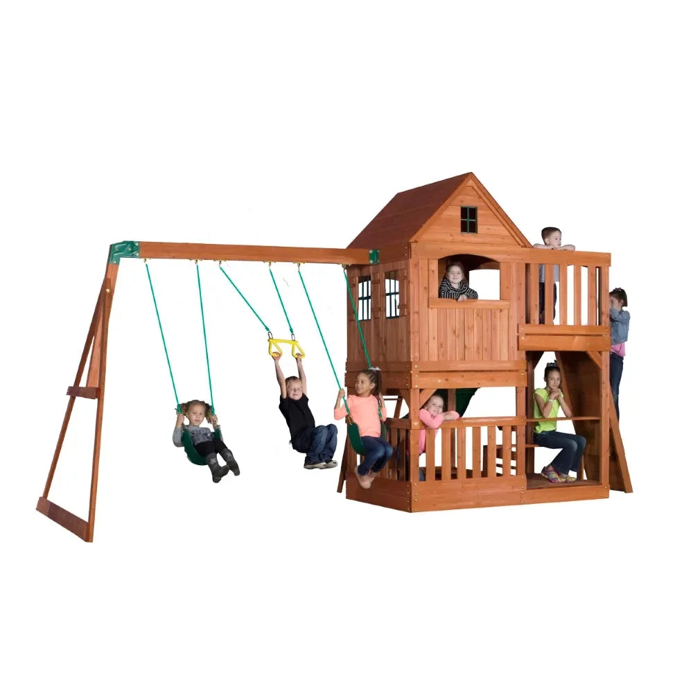 The Backyard Hillcrest Play Tower Including Swings is an expertly designed, all-cedar wooden swing set that brings the excitement and charm of California’s coastal lifestyle right into your backyard. Perfectly suited for children aged 3 to 10 years, this versatile playset offers a multi-level outdoor playground experience combining active fun, social interaction, and imaginative play in a single, compact design. Its spacious upper fort resembles a quaint barn-style clubhouse with a second-level balcony that encourages adventurous play, while the lower deck includes a thoughtfully designed half picnic table and sandbox area that invites children to relax, share snacks, or engage in sensory play.
