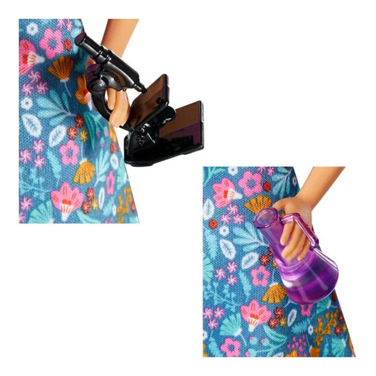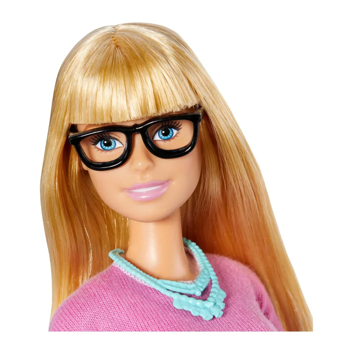 The Barbie Teacher Doll comes stylishly dressed in a professional classroom outfit featuring a pink top, a blue floral skirt, a matching necklace, white shoes, and classic black eyeglasses, completing her confident teacher look. With 10 school-themed accessories, including a spinning globe, a laptop that opens and closes, science tools like a microscope, beakers, flasks, and protective goggles, this playset encourages hands-on role-play while promoting interest in STEM subjects. Kids can even take learning further with the clipboard and book accessories, perfect for pretend grading or lesson planning.