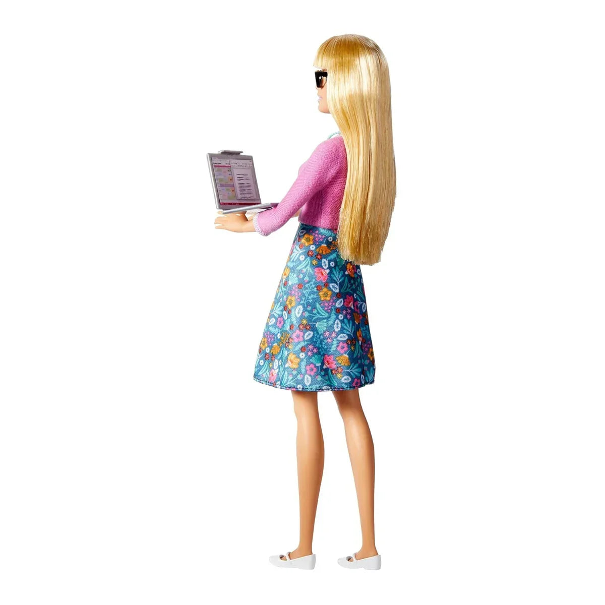 Stylish Teacher Outfit – Barbie doll wears a pink top, floral skirt, necklace, white shoes, and eyeglasses, perfect for her role.