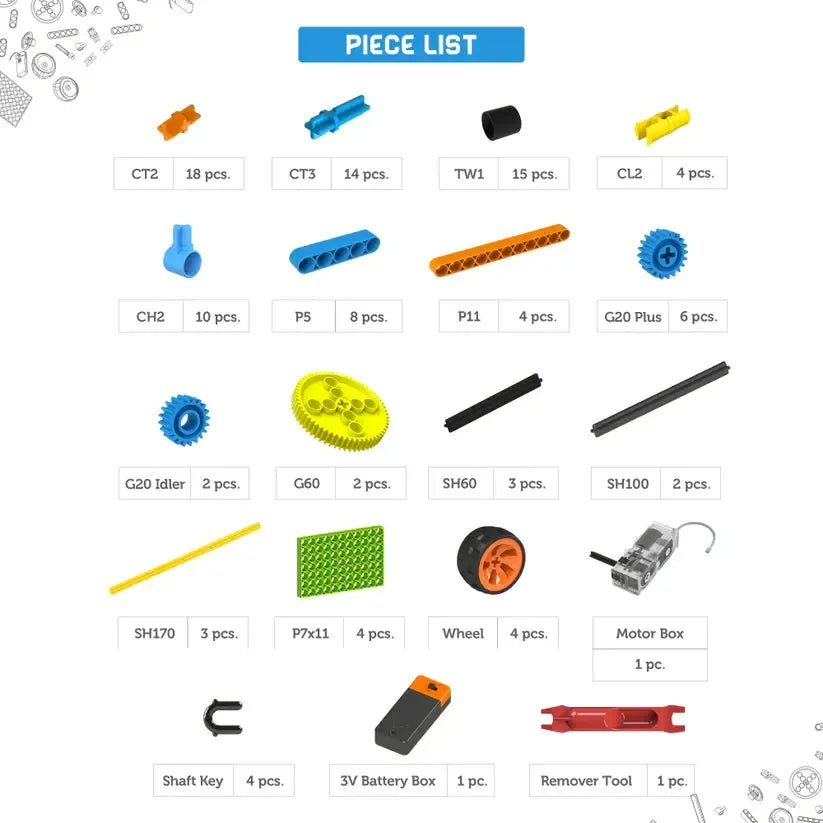 100+ Interchangeable Parts: Robust, reusable, and modular pieces made for multiple reconstructions and imaginative creations.