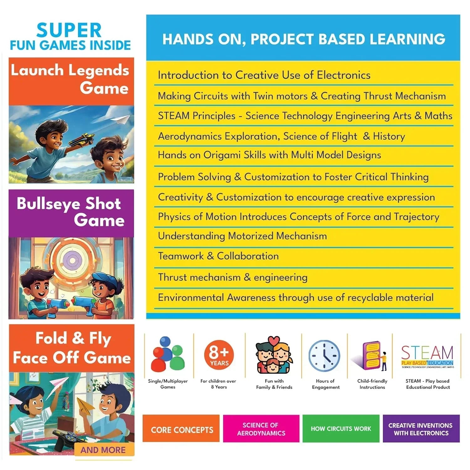 Inspire young minds to explore the exciting world of physics and aerodynamics with the Be Cre8v Motorized Plane Launcher & Power Shooter Kit—a hands-on DIY STEAM educational toy designed for curious kids aged 8 to 14. Developed to blend real science with real fun, this interactive kit introduces children to key concepts like motion, force, and engineering through active experimentation and high-flying fun.