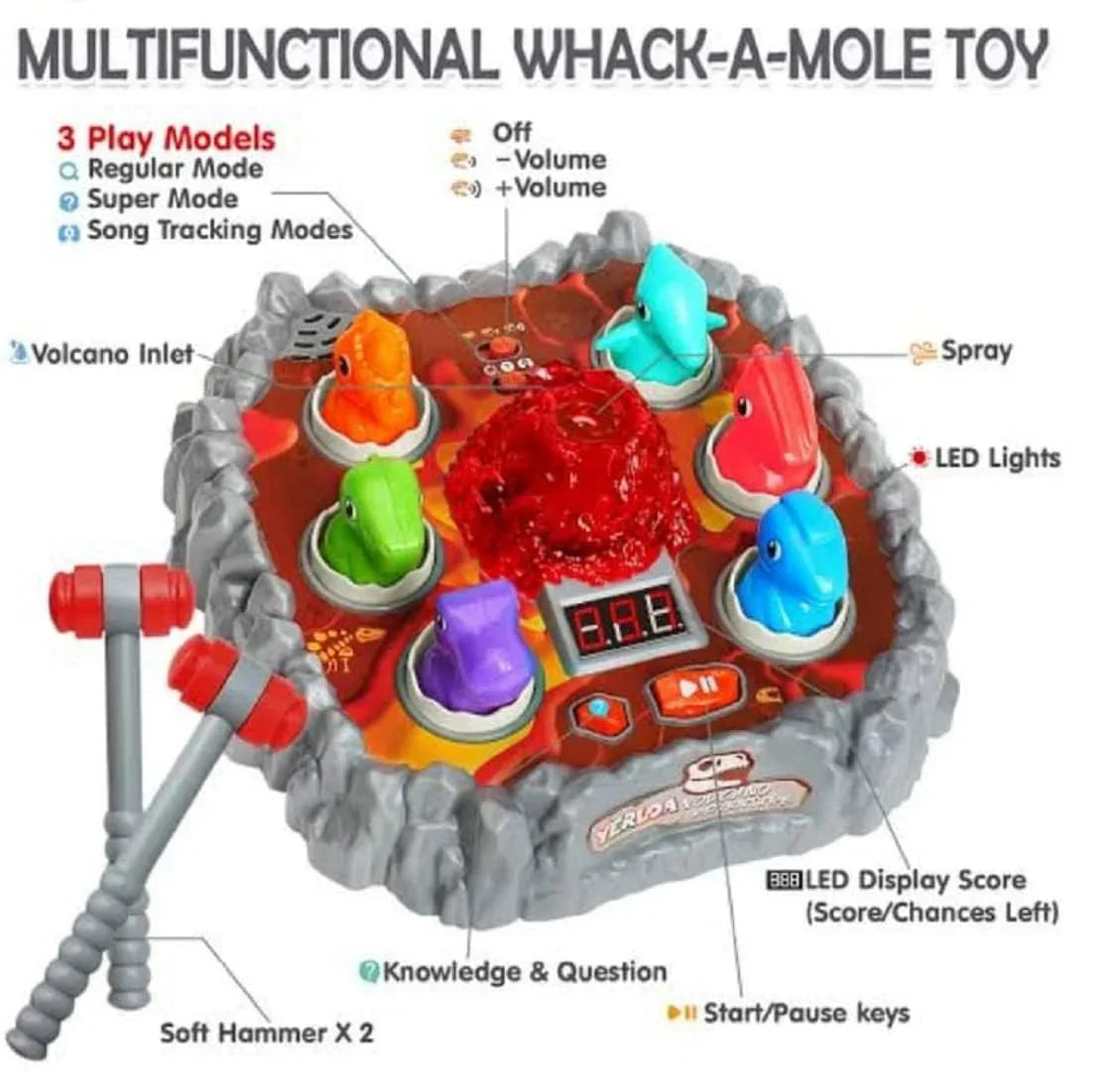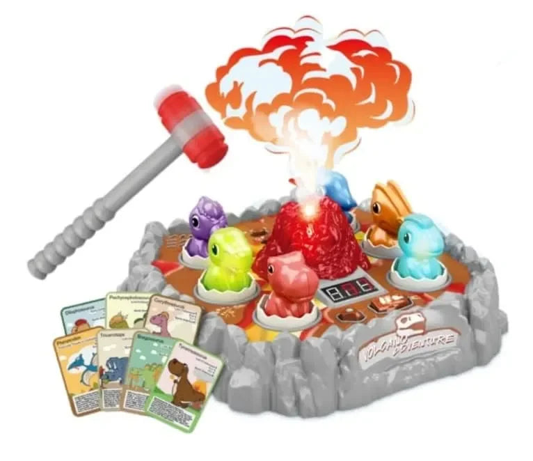 Ideal for children aged 5 and above, the Dinosaur Battle Game Toy set includes 6 colorful dinosaur figures, 7 beautifully illustrated dinosaur cards, 2 soft and safe hammers, and a realistic volcano that sprays mist, simulating a volcanic eruption. With 6 adjustable speed levels and 3 interactive gameplay modes, this game challenges children’s reflexes, timing, and coordination while keeping them engaged for hours.