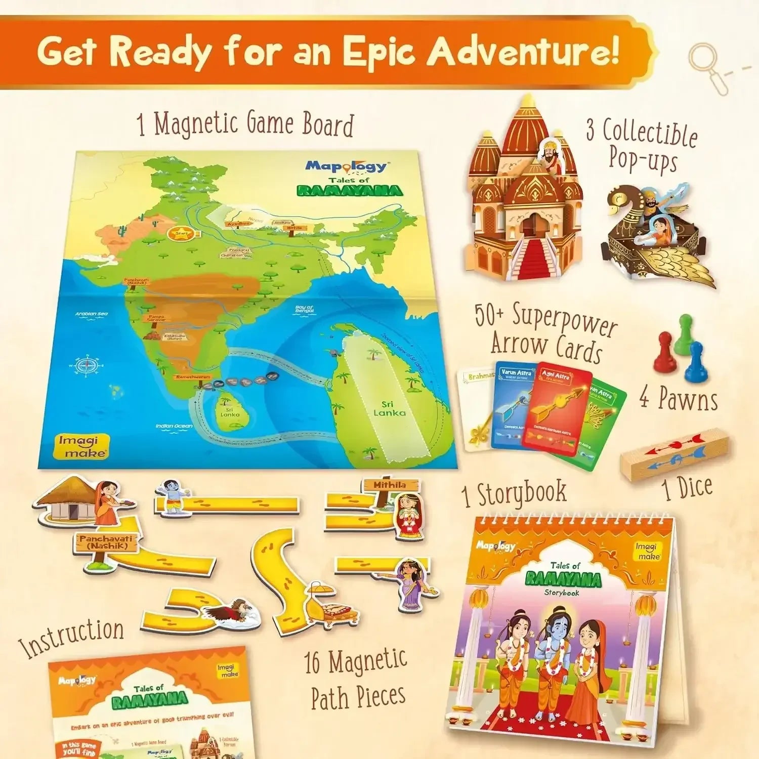 Imagimake Mapology Tales of Ramayana | 3-in-1 Magnetic Board Game, Ramayana Storybook, and Trump Cards | Interactive Educational Family Game for Kids Age 8-12