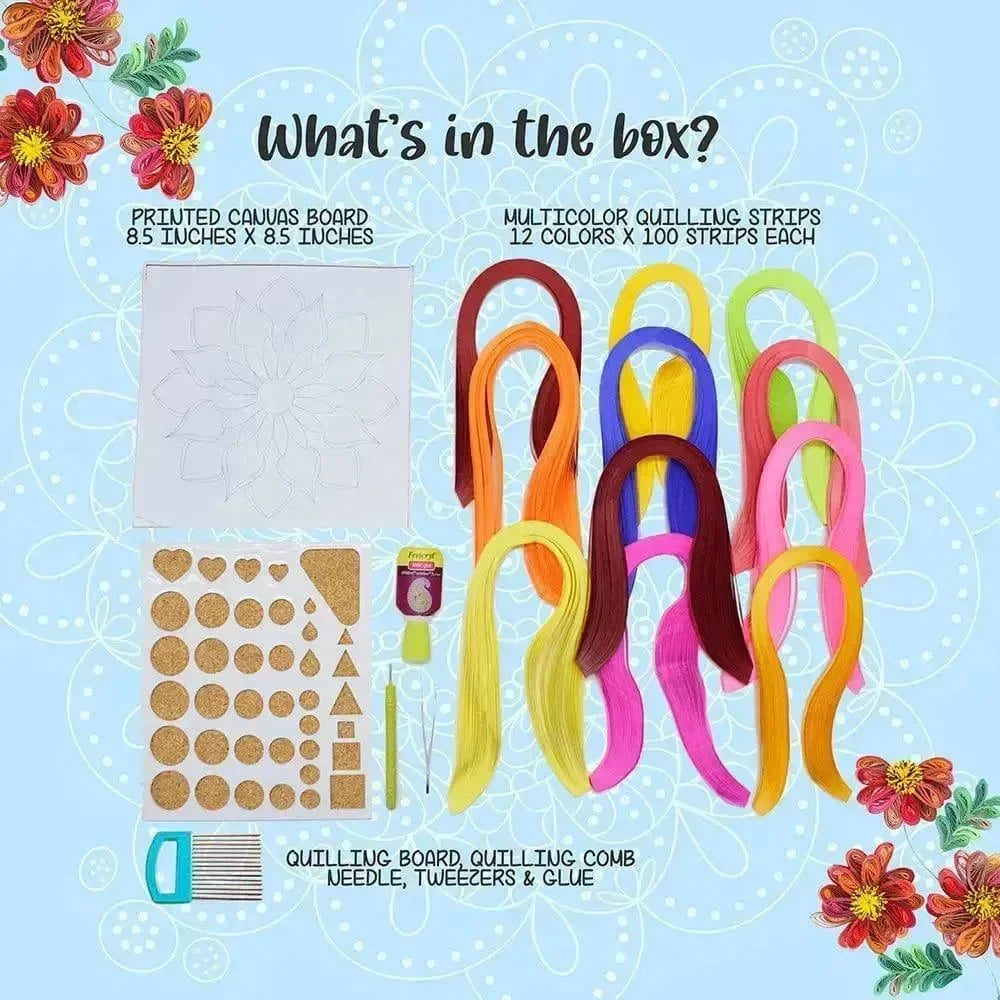 • 🧩 Complete Kit with 1200+ Quilling Strips: Includes everything you need—1 pre-printed 8.5x8.5 inch canvas board, 1200 colorful strips, glue, needle, comb, tweezers, and a quilling board.