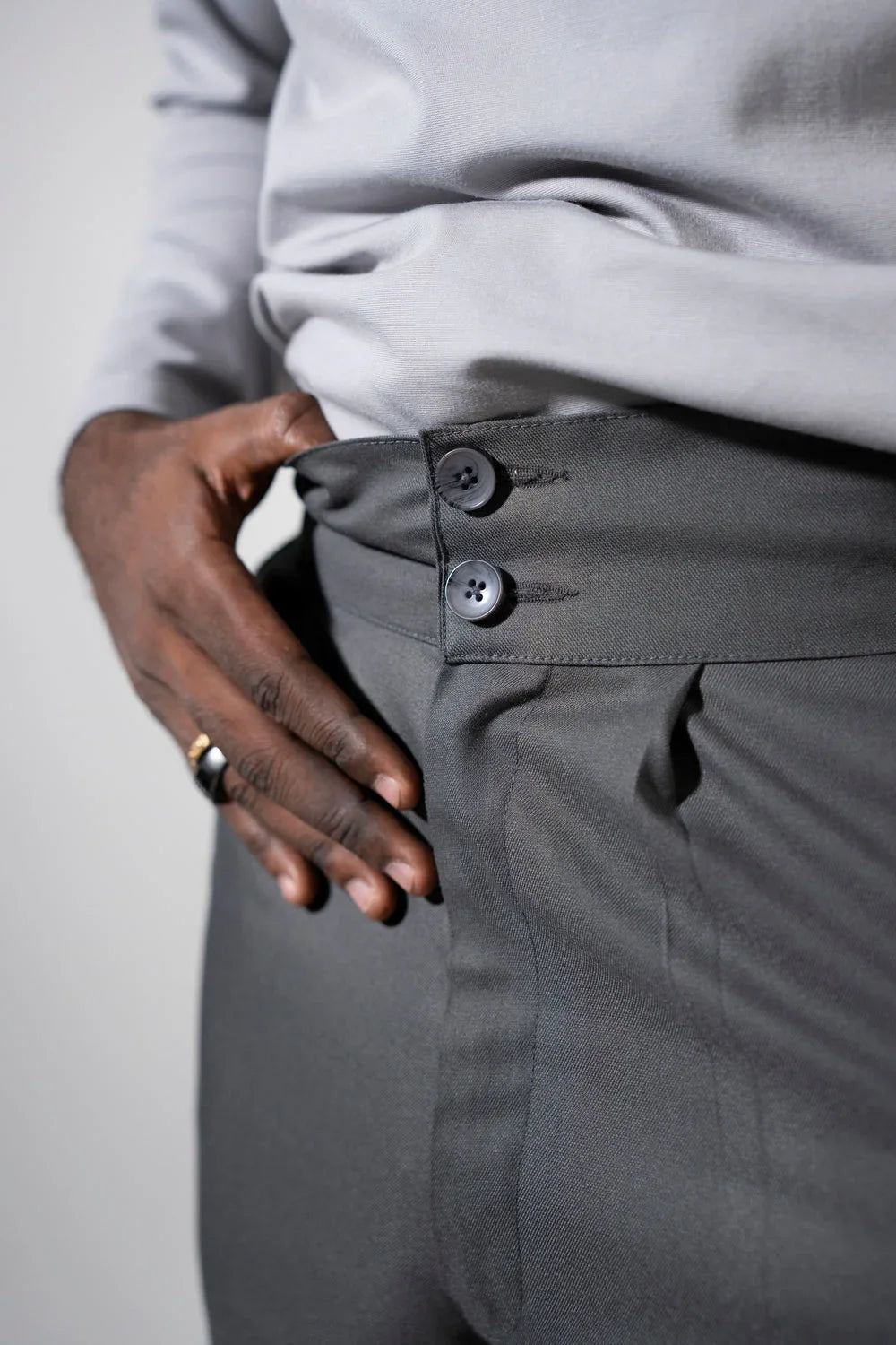 Redefine basics with mid-waist trousers. Unique broad waistband and vertical button detail bring structure and statement to your everyday rotation.