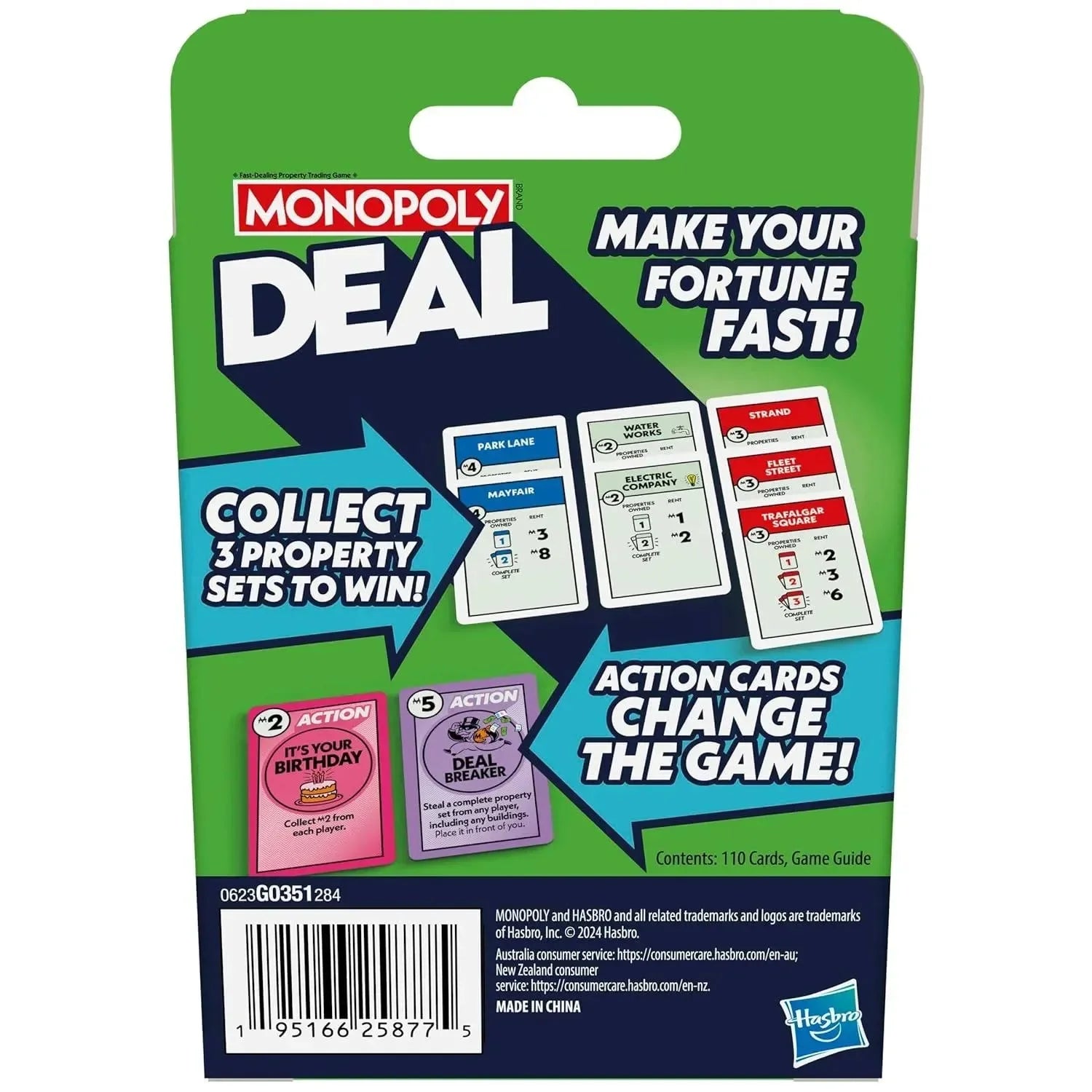 Bring home the excitement of the iconic Monopoly game in a compact, action-packed version with the Hasbro Gaming Monopoly Deal Card Game. Designed for quick play and endless fun, this card game is perfect for both casual and competitive game lovers. Unlike the traditional board game, Monopoly Deal focuses on strategy, speed, and card play, allowing players to swap, steal, and scheme their way to victory. The goal? Be the first to collect three full sets of properties in different colors while using action cards to sabotage your opponents. Whether you're at home, on vacation, or hosting a quick game night, Monopoly Deal delivers high energy in just 15 minutes per game. Itβs suitable for 2 to 5 players, ages 8 and up, and includes reference cards to help everyone jump right inβeven if theyβve never played before.