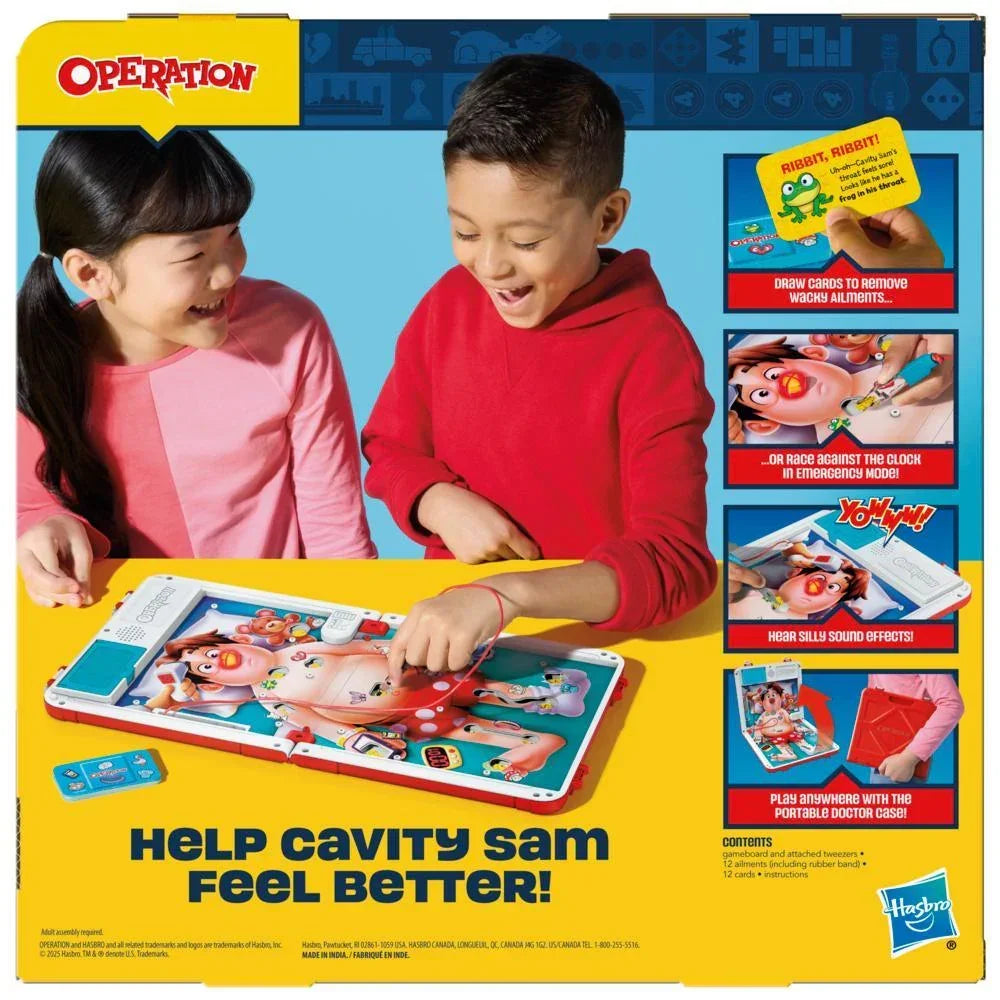 Designed for kids aged 6 and up, this version includes Hospital Mode for classic gameplay and Emergency Mode for fast-paced challenges with a ticking timer and sound reactions from the patient, Cavity Sam. Players try to remove wacky ailments like “Glued to His Phone” or “Frog in His Throat” using tweezers—without touching the sides. If they slip—BZZZT!—the patient’s nose lights up, or in Emergency Mode, he makes silly sounds like burps and sneezes.