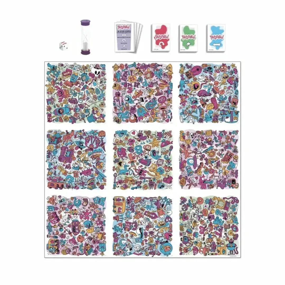 In this wildly addictive picture hunt game, players draw mission cards in three categories—blue (find-it-fast), red (bid-and-find), and green (personal challenges)—that dictate the objective of each round. From spotting a "dinosaur" to identifying a "crazy hairdo," every mission draws from over 100 unique challenges that demand speed, concentration, and a keen sense of visual detail. Each mission sends players scanning 9 colorful, double-sided tiles brimming with illustrated objects and doodles. With every flipped card, the game shifts and resets the battlefield, ensuring no two rounds are ever the same.