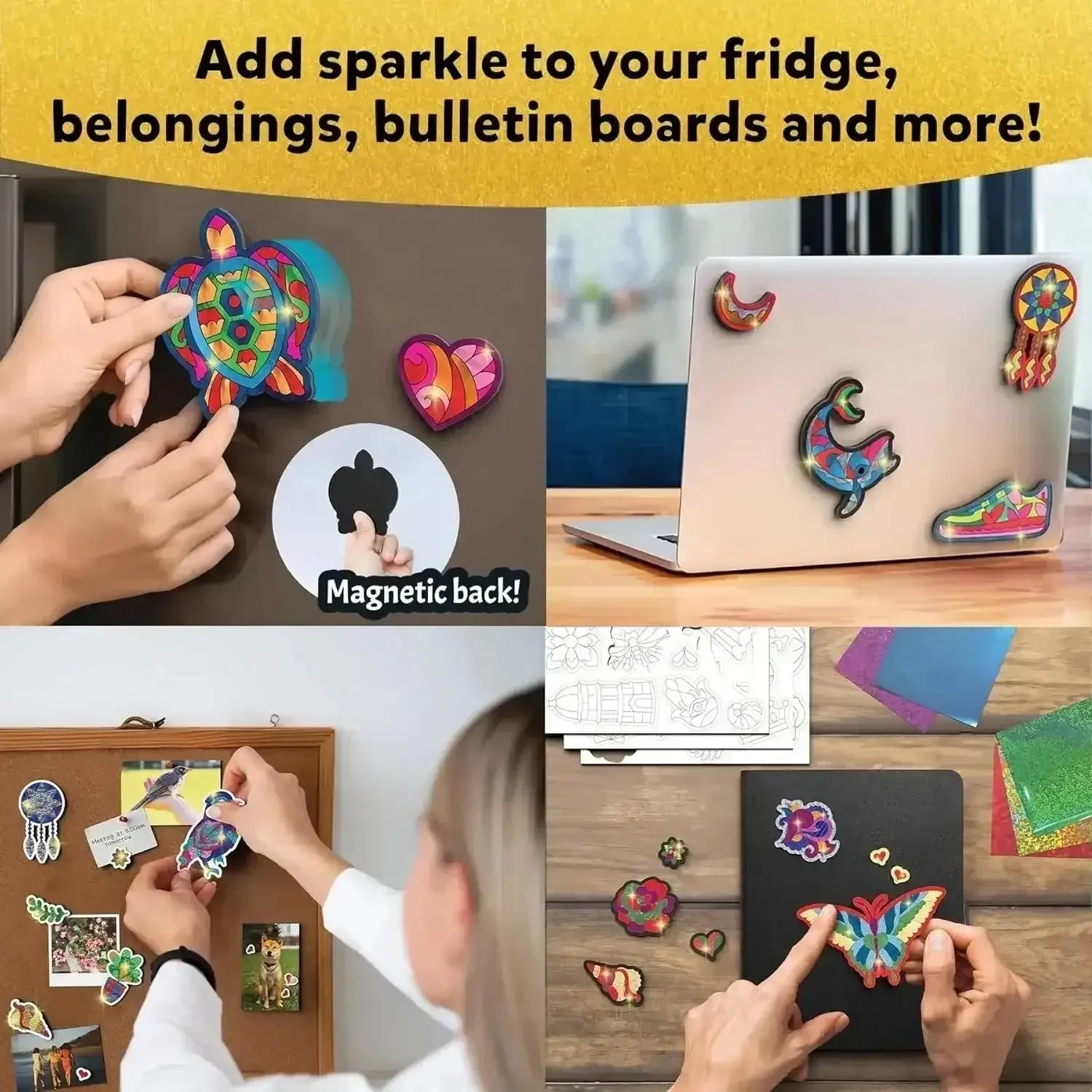 Create your own shiny magnets and stickers using foam bases and bright foil sheets—no glue or mess required.