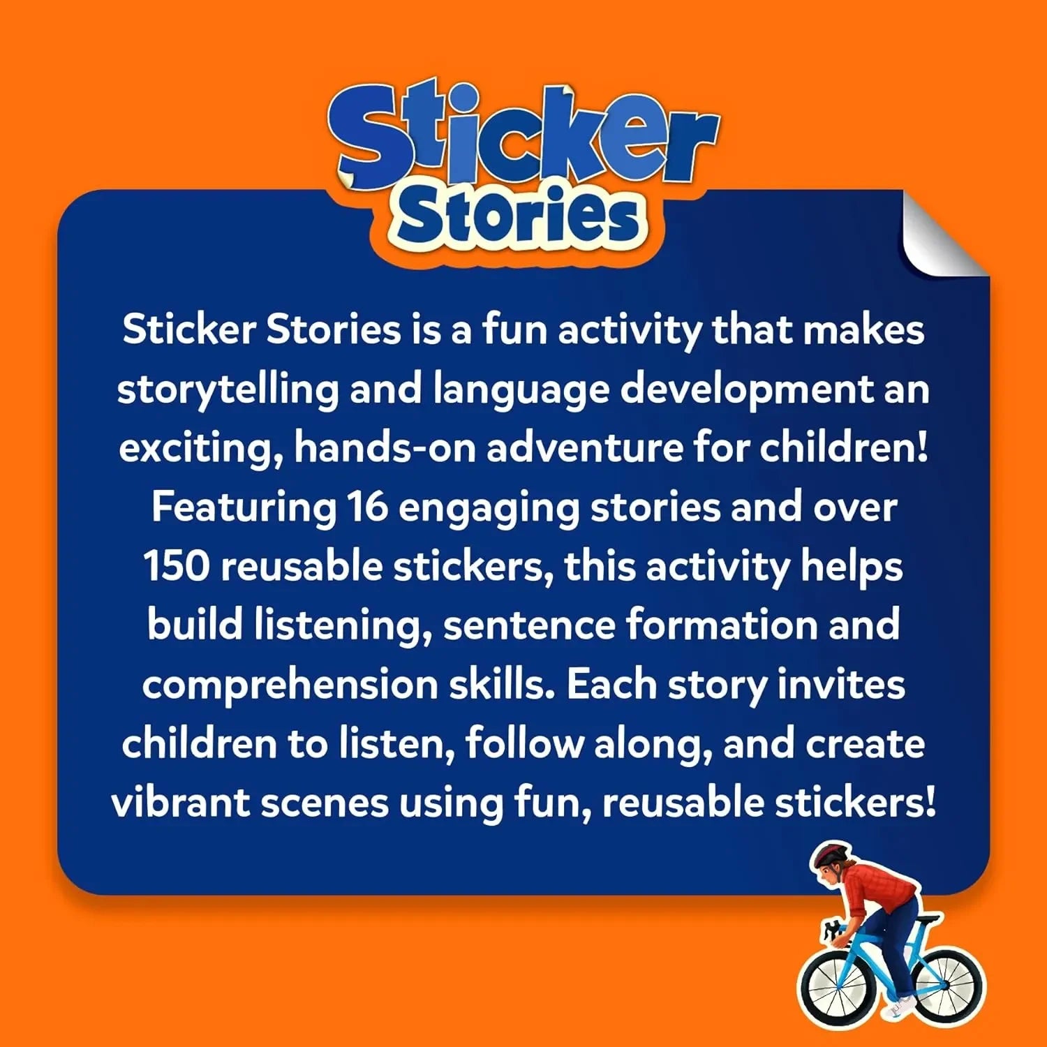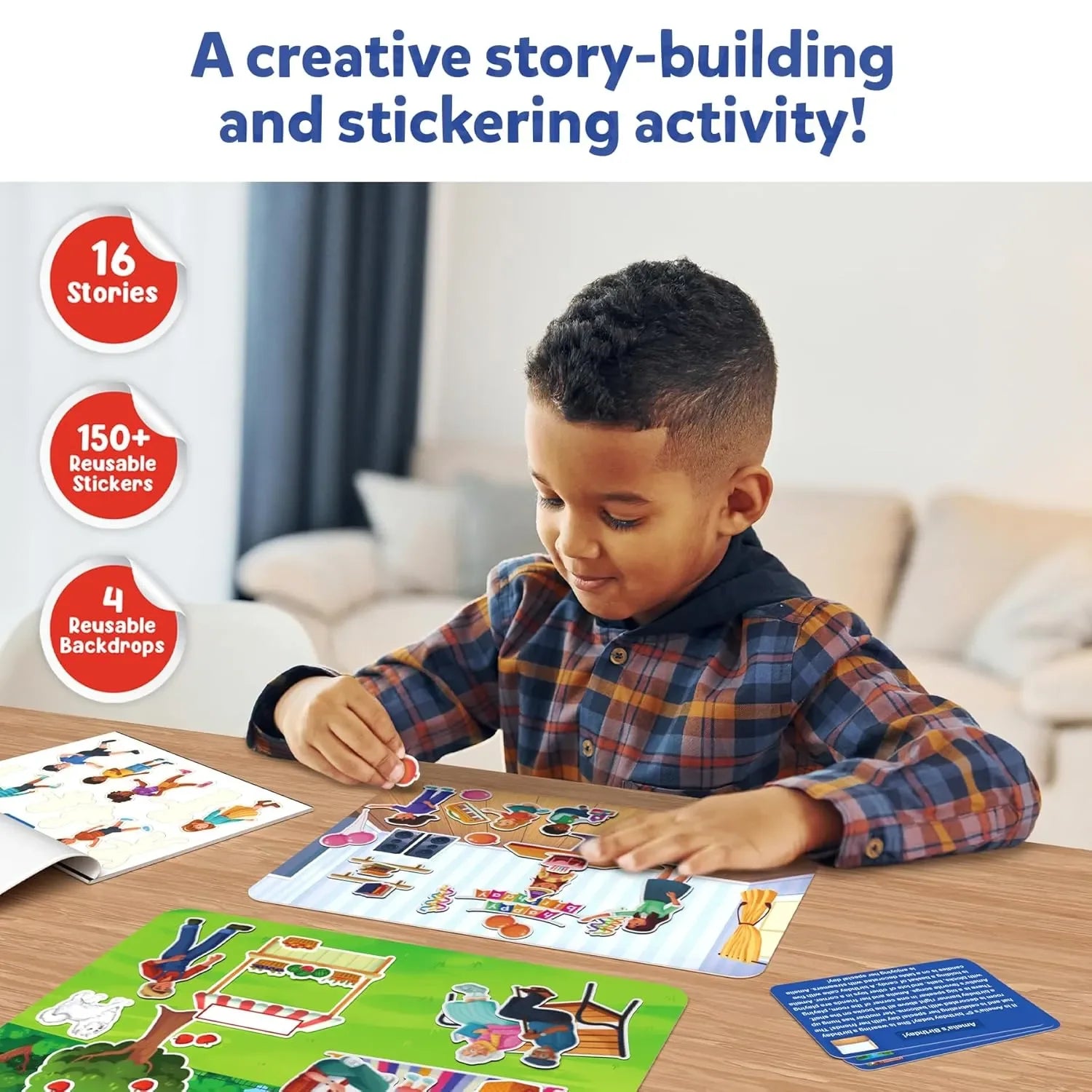 Includes 1 sticker book (150+ reusable stickers), 2 double-sided scene boards (4 story scenes total), 8 double-sided story cards (16 guided stories), and an instruction manual.