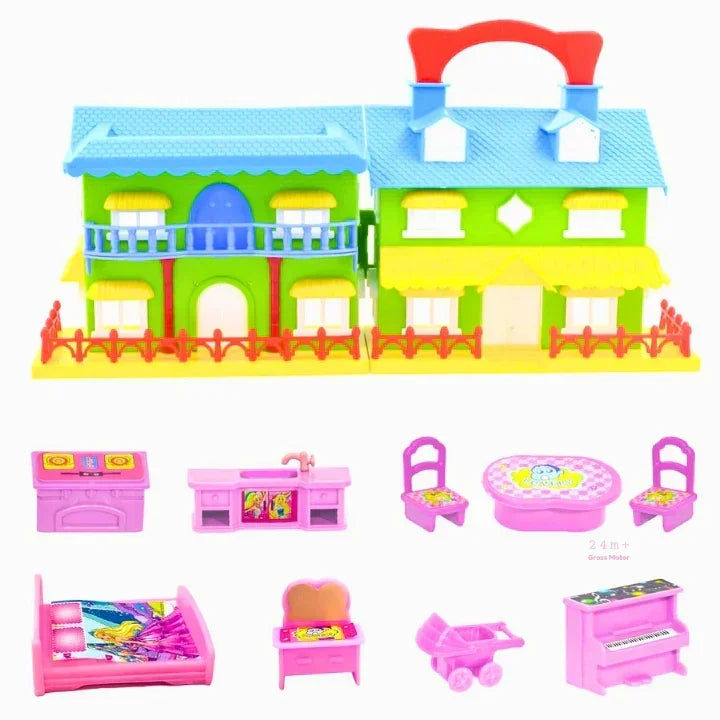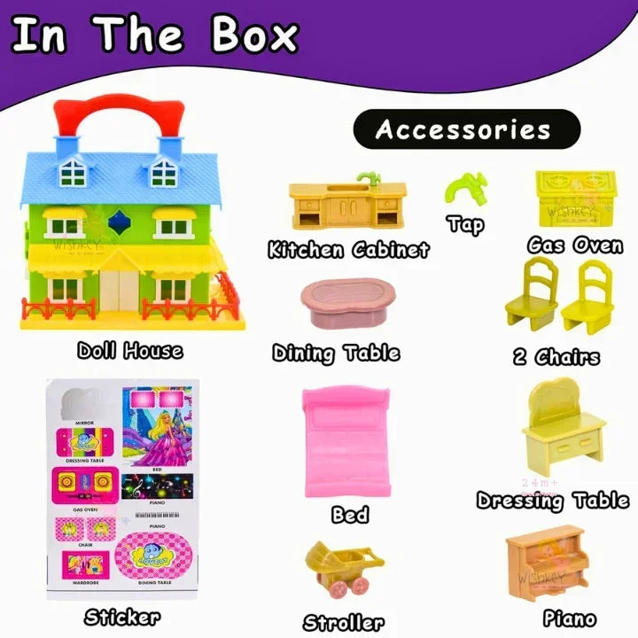 • Includes: Furniture accessories, stickers, bedroom, piano, dining setup, stroller