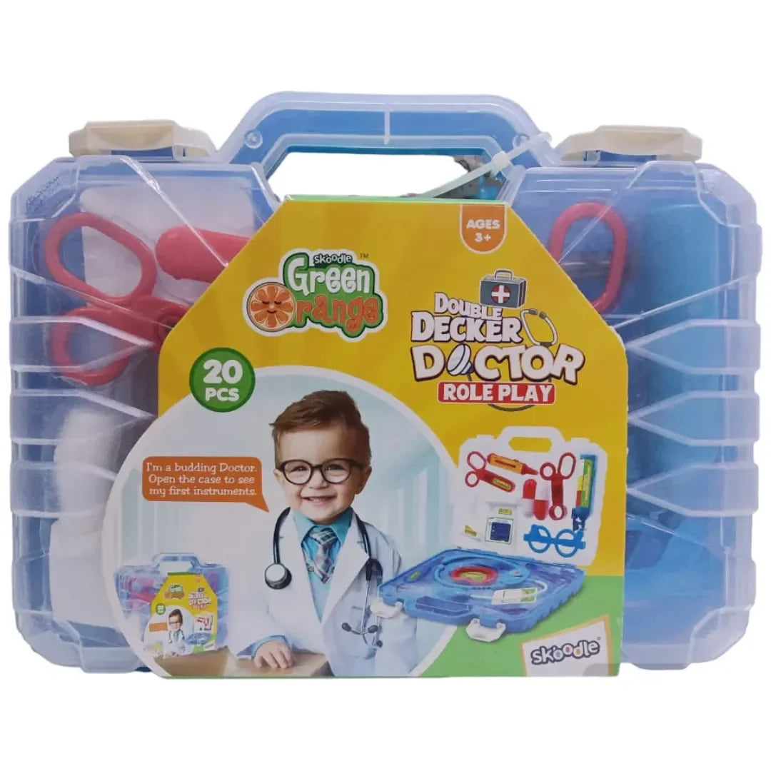 Step into the world of imagination, care, and creativity with the Skoodle Green Orange Double Decker Doctor Role Play Set, a thoughtfully designed pretend play toy for kids aged 3 years and above. This vibrant and interactive medical kit helps children explore the world of healthcare through imaginative storytelling and role-playing as a doctor.