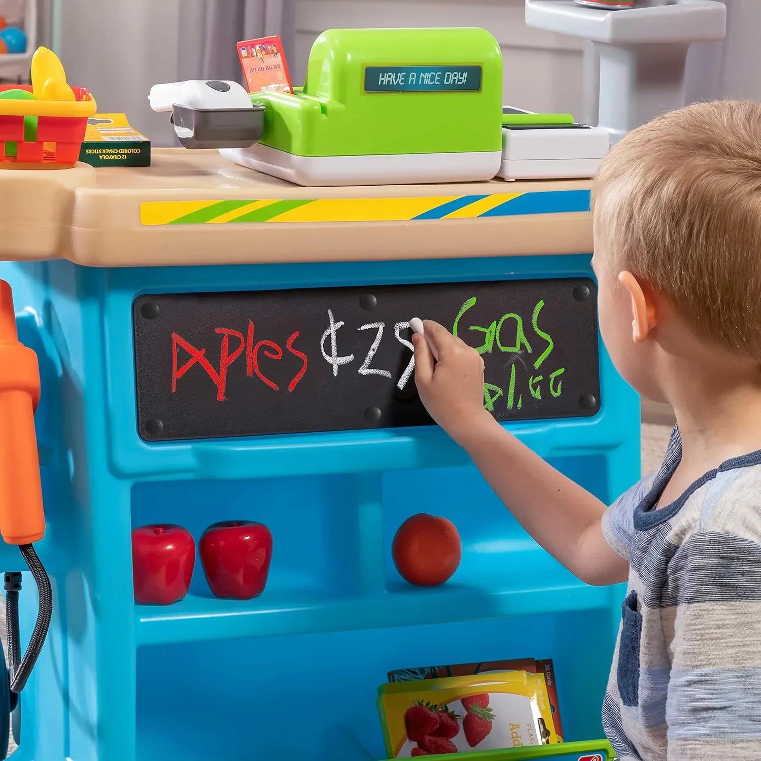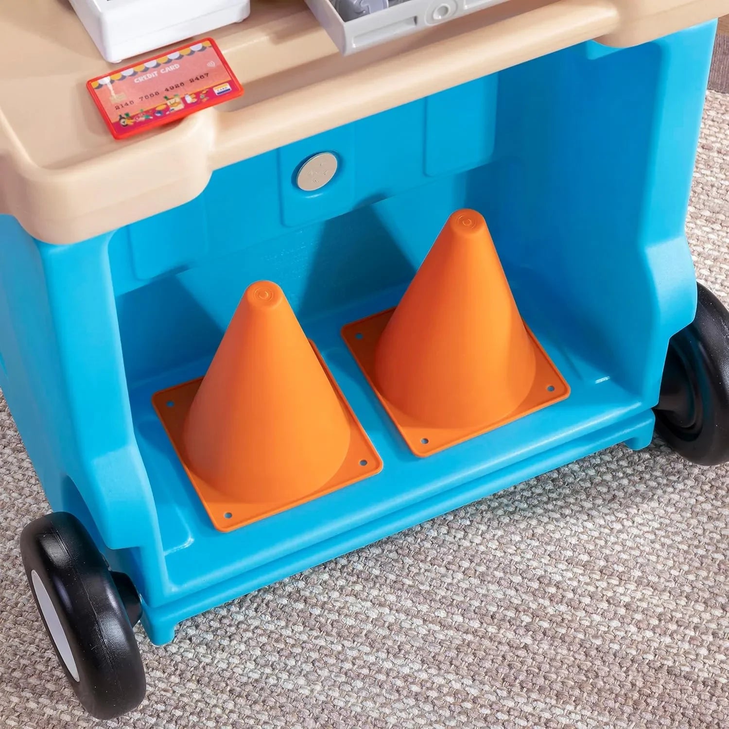 The Step2 Stop & Go Market is a versatile playset that lets kids run their own mini marketplace, complete with a gas station, toll booth, and cashier stand. Little entrepreneurs can role-play as shopkeepers, gas attendants, or toll collectors while engaging in imaginative and social play. The set includes a chalkboard for writing specials or gas prices, an electronic cash register for transactions, and traffic cones to guide customers. With wheels for easy mobility and an umbrella for shade, kids can set up their shop anywhere for endless fun. Built with durable materials for long-lasting play, this interactive market encourages creativity, problem-solving, and customer service skills for children aged 3 to 8 years.