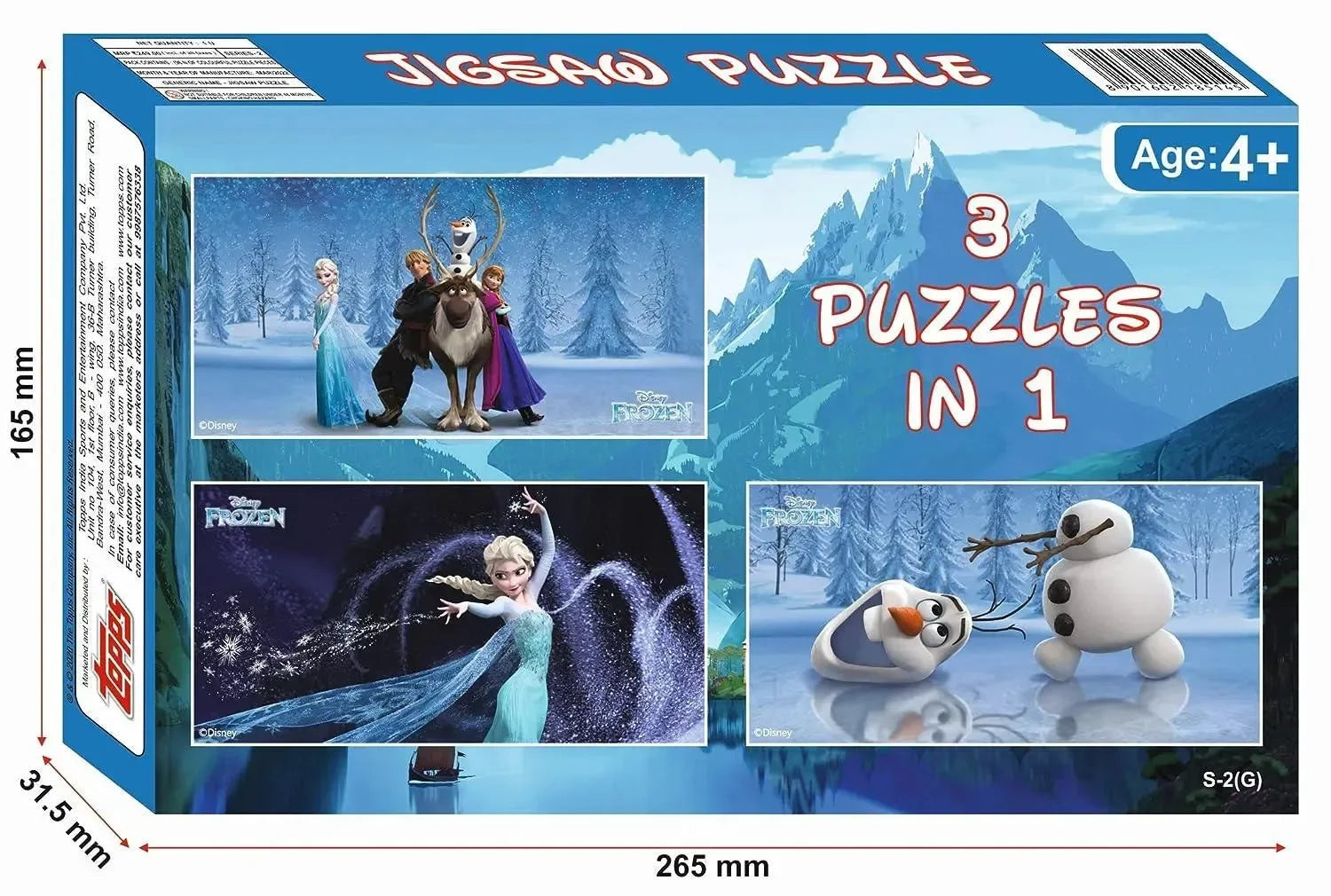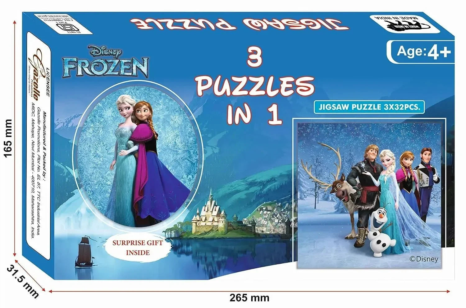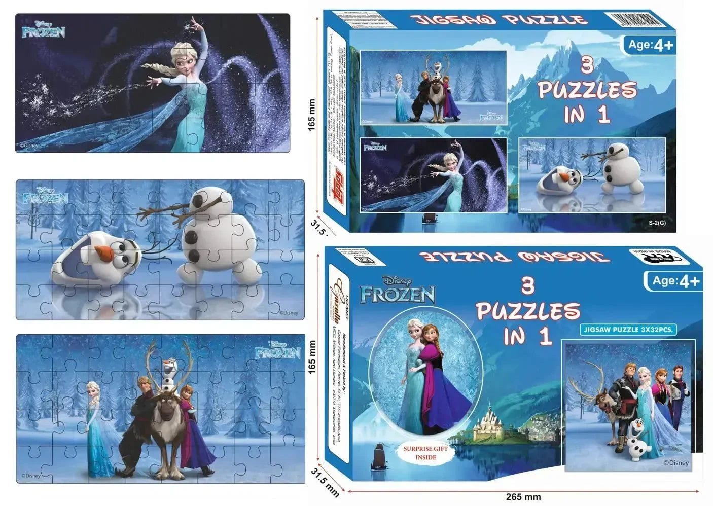 Introducing Jigsaw Puzzle Frozen 3 in 1 - A Perfect Pastime for your child, offering matchless knowledge and joy with captivating colors. It's a great way to spark children's interest in subjects, while enhancing memory retention, self-esteem, and positive mindset growth. An all-time superb birthday gift for children aged 4 and above, both boys and girls. Made in India with eco-friendly packaging, each set contains 3 puzzle sheets, each with 32 pieces, featuring official licensed characters. Crafted from durable cardboard with outstanding prints, these creatively designed puzzles are long-lasting and come with a GUARANTEED SURPRISE GIFT INSIDE, making learning an enchanting adventure.