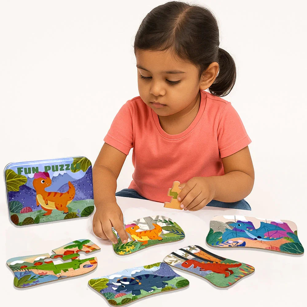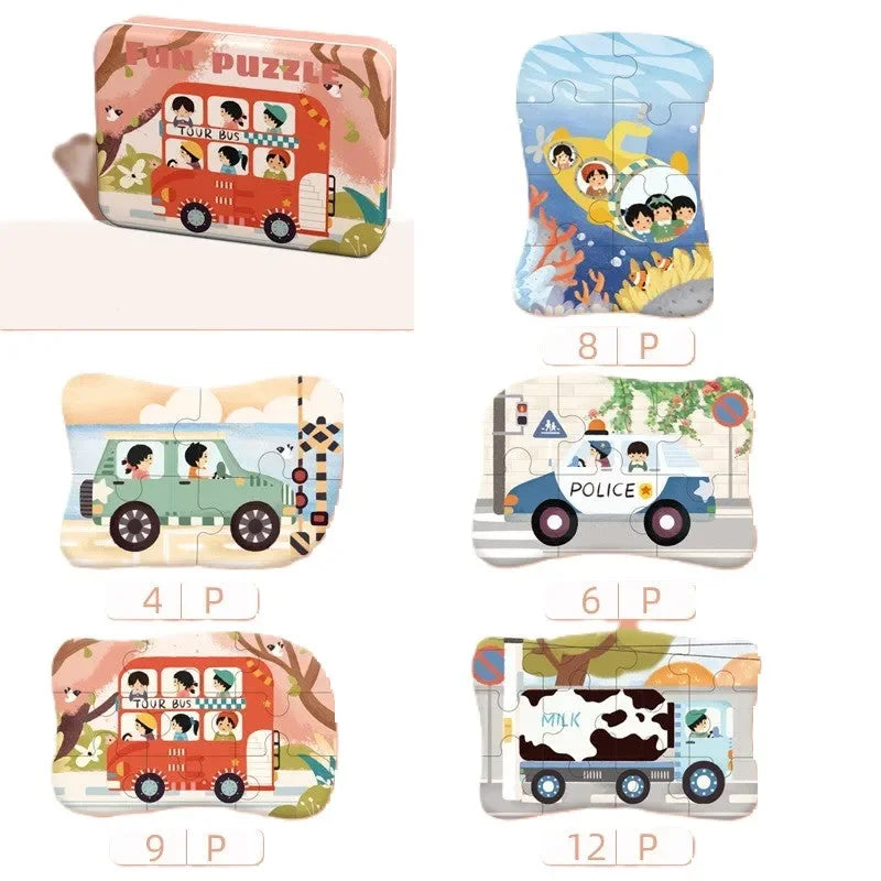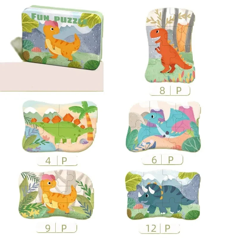 Progressive Puzzle Metal Box toddlers to learn colors, shapes, numbers, and different object recognition. 5 different puzzles in every box. Builds tactile, motor, thinking, and learning skills, help to develop children's cognitive abilities, hand-eye coordination, fine-motor skills. They are fun, brain-boosting, stimulating, and provide a learning experience while playing.