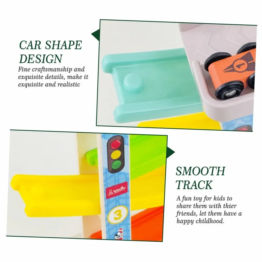 1. Endless Racing Fun: Watch little ones delight as the colorful mini cars zoom down the four bright ramps of this wooden car track! The continuous motion design keeps the action going, providing engaging entertainment for toddlers.